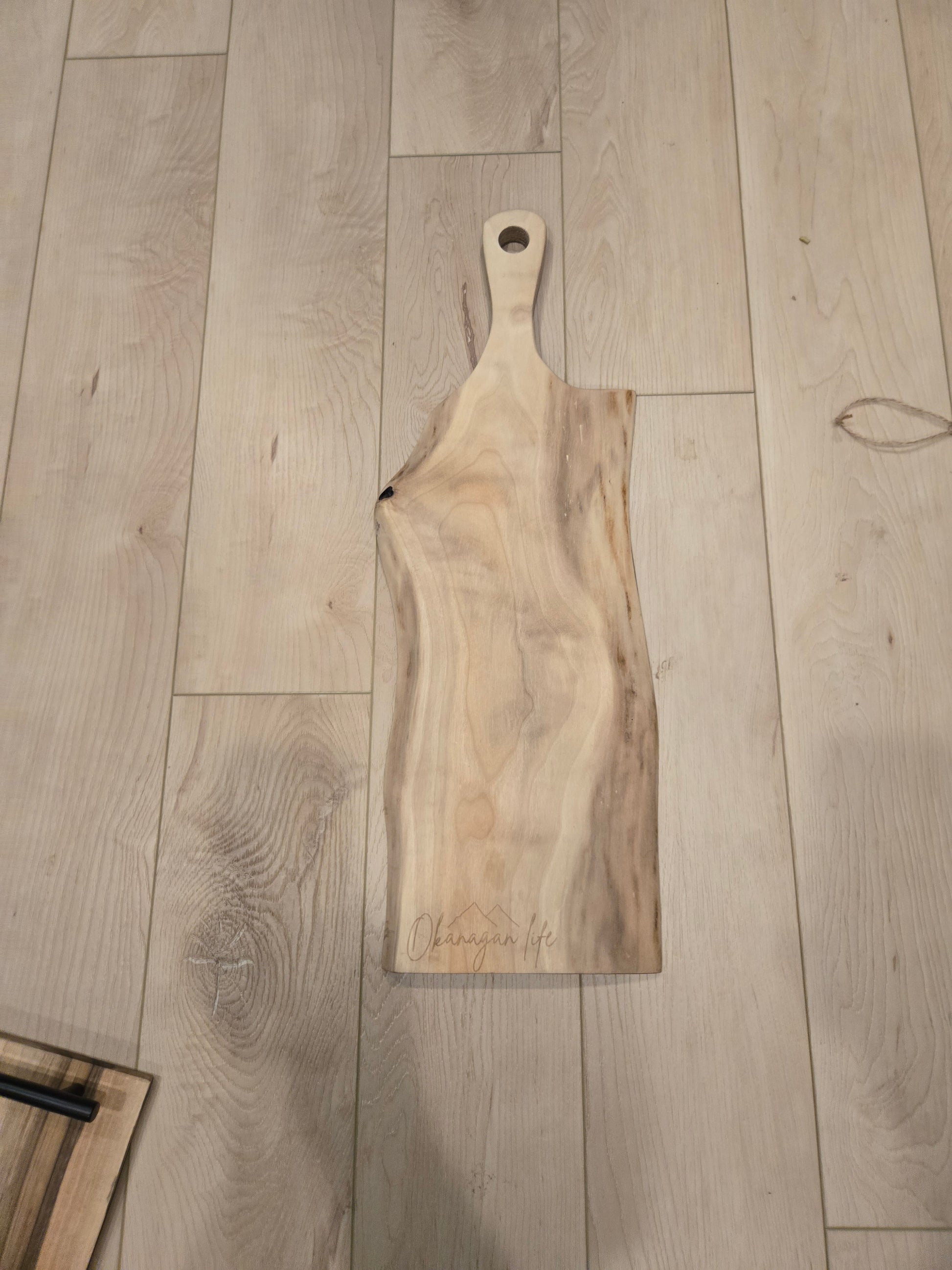 Crafted from premium walnut wood, the Mocha Walnut Board features a distinctive live edge that highlights the natural beauty of the grain. Engraved with the phrase "okanagan life," this board combines elegant design with rustic charm, making it ideal for serving or display. Its sturdy construction ensures long-lasting use, while the engraved detail adds a personalized touch reflecting the spirit of the Okanagan region.