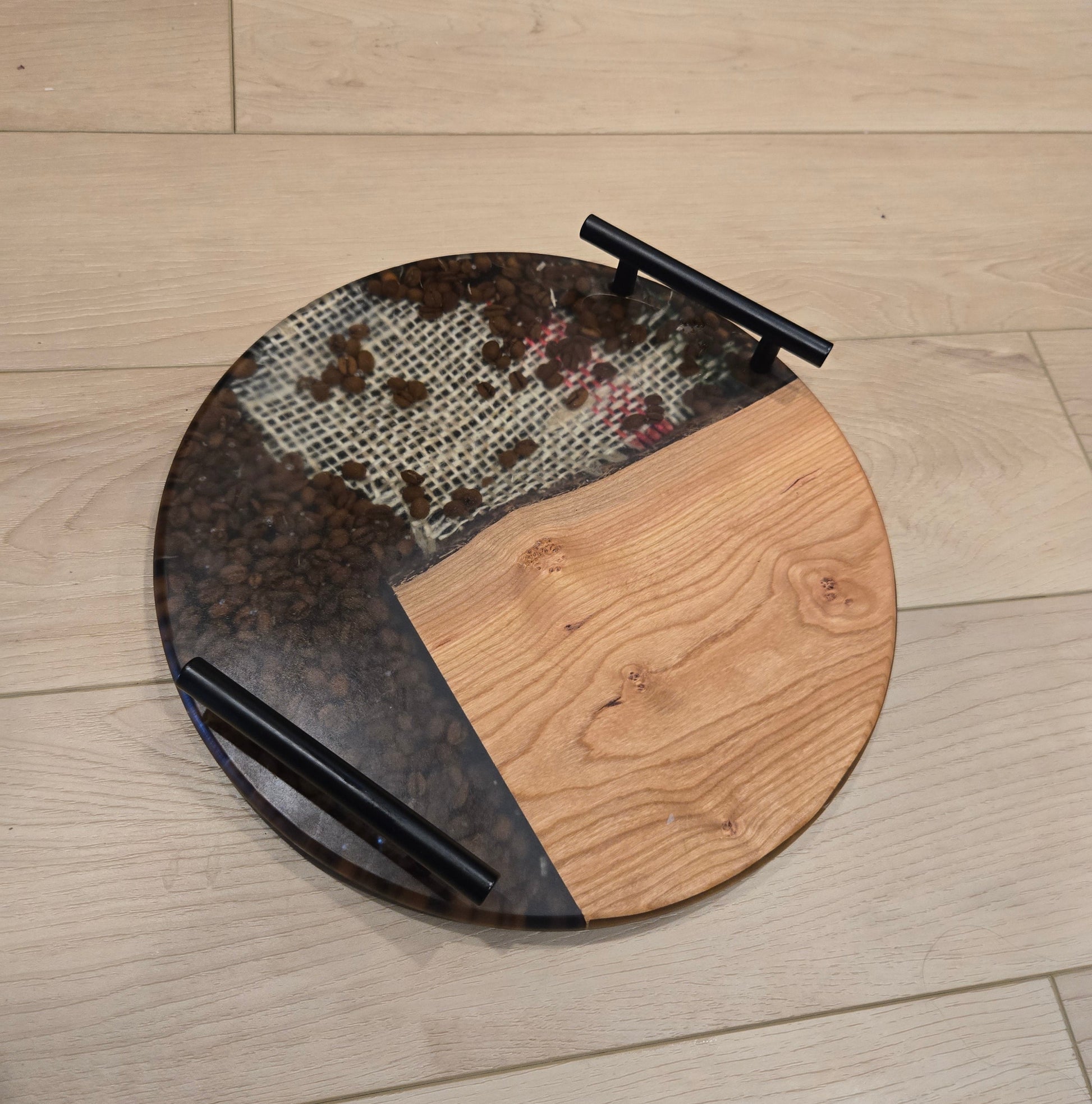 The deep amber tones of the cherry wood pair beautifully with the rich browns of the embedded coffee beans, creating a design that’s both cozy and eye-catching. Each board is individually poured, sanded, and finished with food-safe oils to bring out the wood’s natural grain and ensure long-lasting beauty.