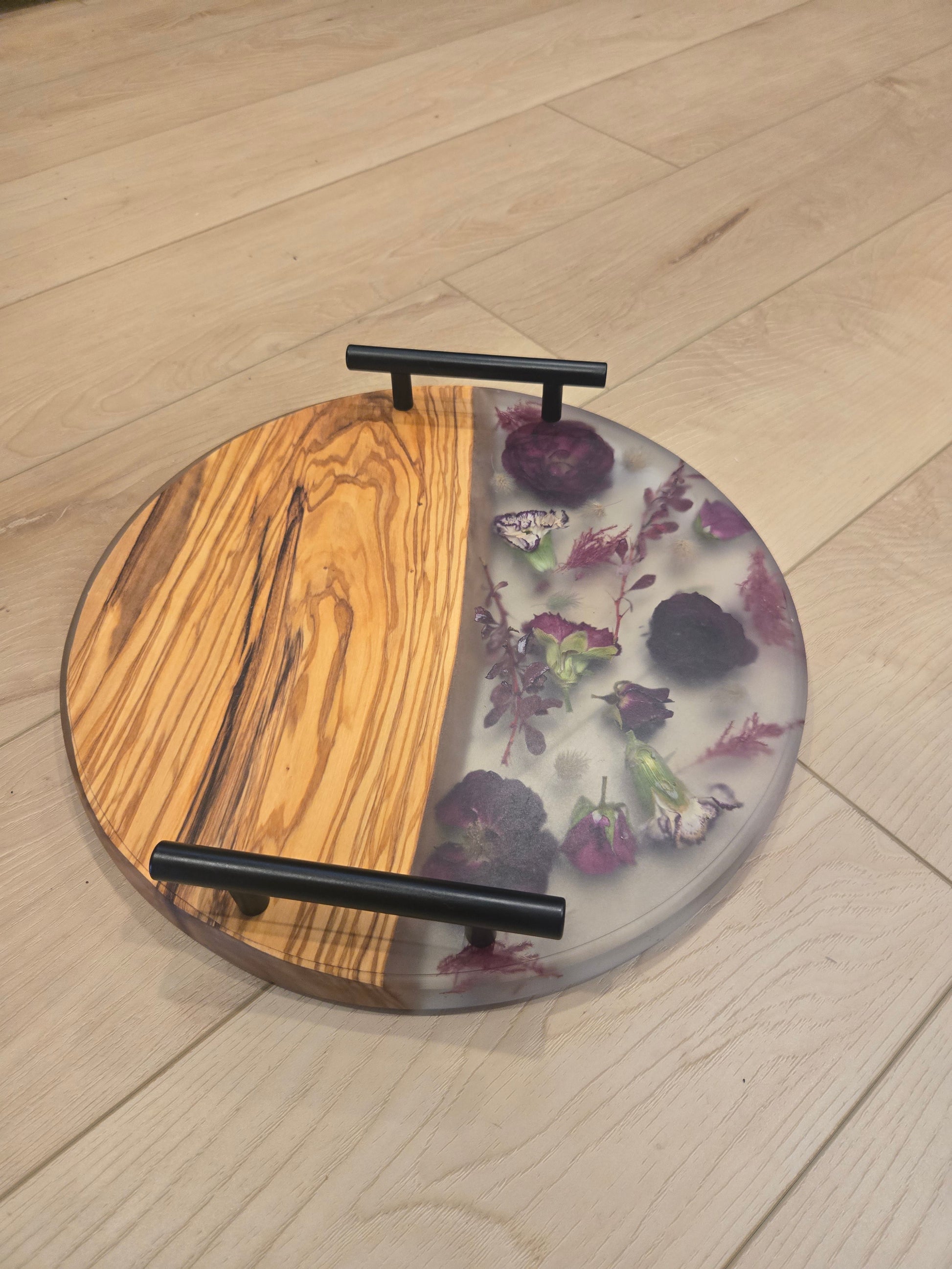 Levate your hosting with this stunning round charcuterie board, handcrafted from rich, golden olive wood and paired with a dreamy half-moon of flower-embedded resin. Each preserved bloom—soft purples, deep berries, and hints of green—rests beneath a smooth, frosted resin surface, creating a gentle, botanical tableau. Sleek black handles complete the design, adding modern contrast to the organic warmth of the wood.