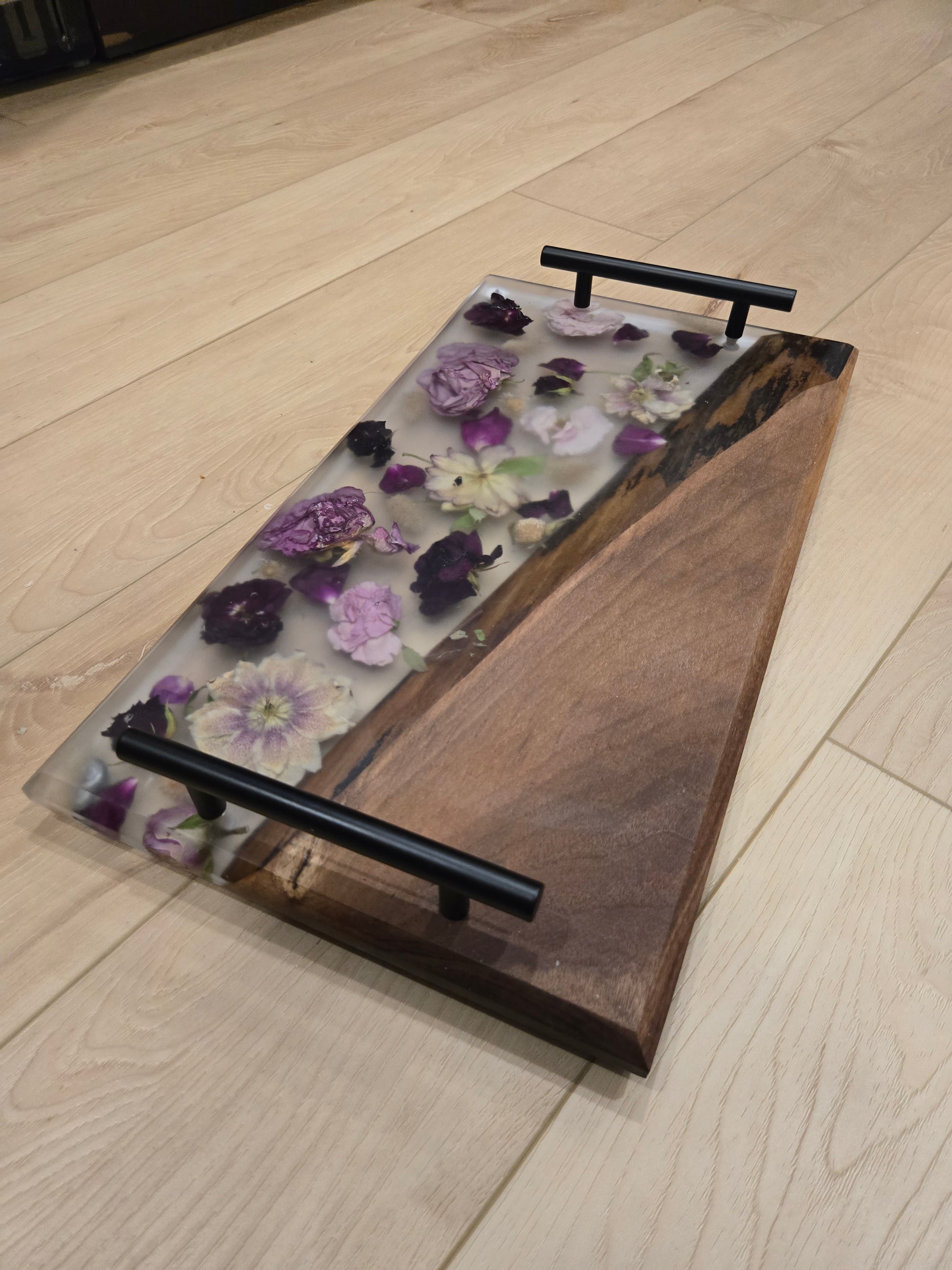 The Midnight Petal Harmony Board is a bold yet romantic fusion of deep walnut wood and a richly palette of purple colored dried flowers. Shades of plum, cream, and soft pastels rest effortlessly within clear resin, creating a striking contrast against the dark, elegant wood grain. Finished with matte black handles for a modern, refined look, this board is perfect for entertaining or displaying as functional art in your home.