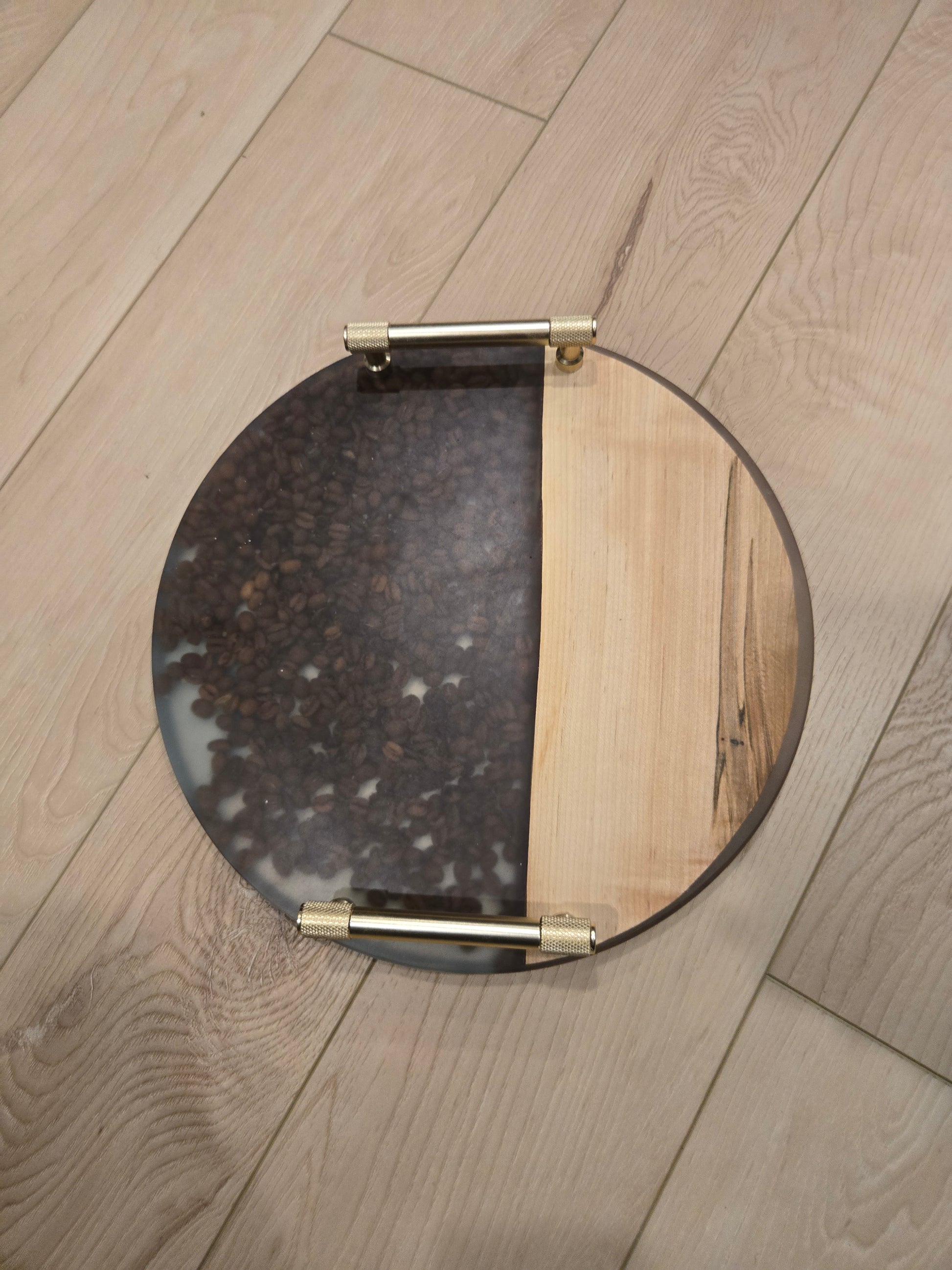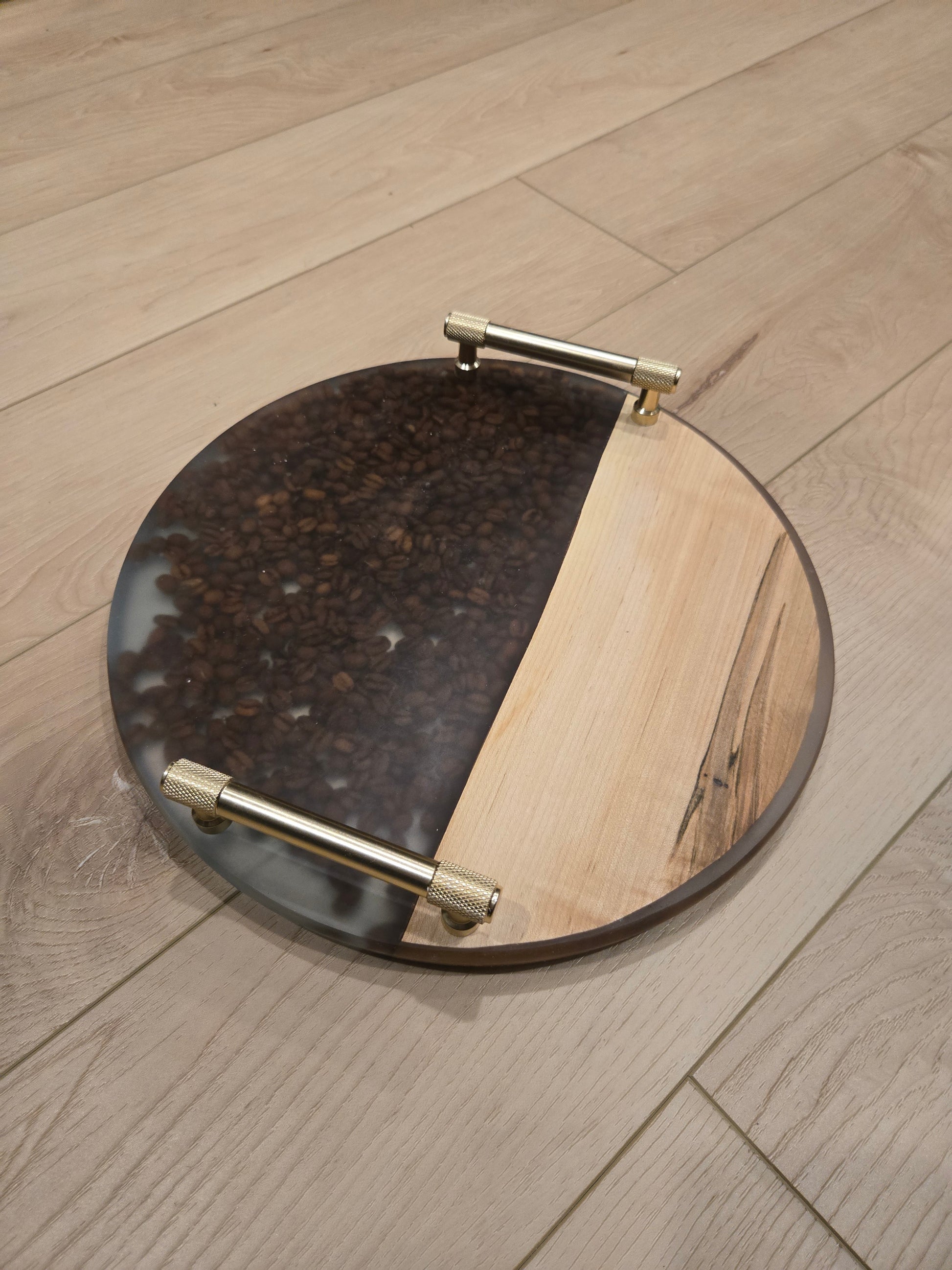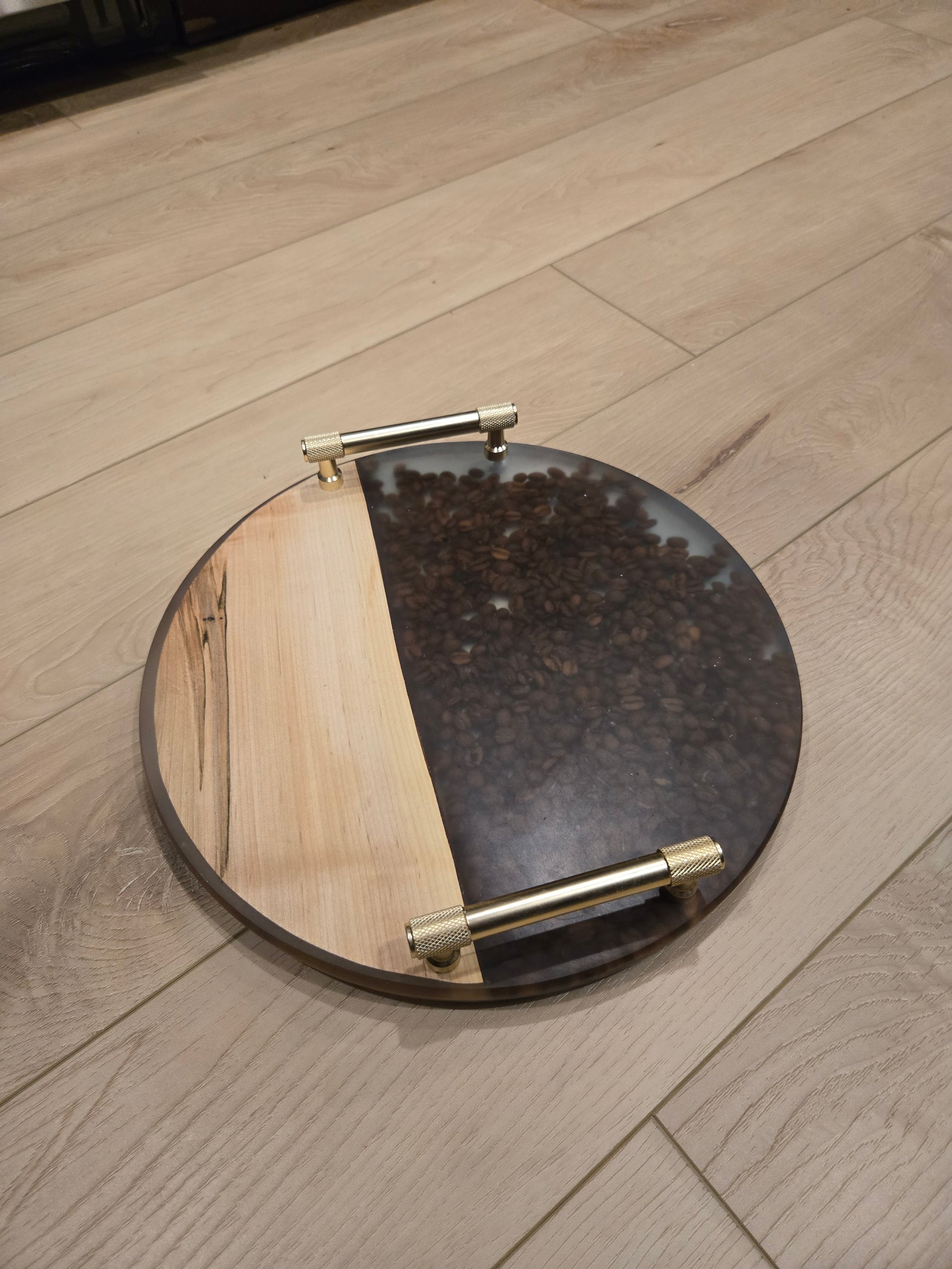 Meet The Morning Brew Board—a handcrafted round serving tray that celebrates everyone’s favorite ritual: coffee. Made with warm, natural maple wood on one half and real roasted coffee beans suspended in crystal-clear resin on the other, this board brings the aroma of cozy mornings straight to your table. Finished with modern gold handles, it’s perfect for serving pastries, hosting brunch, or displaying your favorite décor. Beautiful, functional, and full of character—this tray is a true wake-up call for your hosting game.